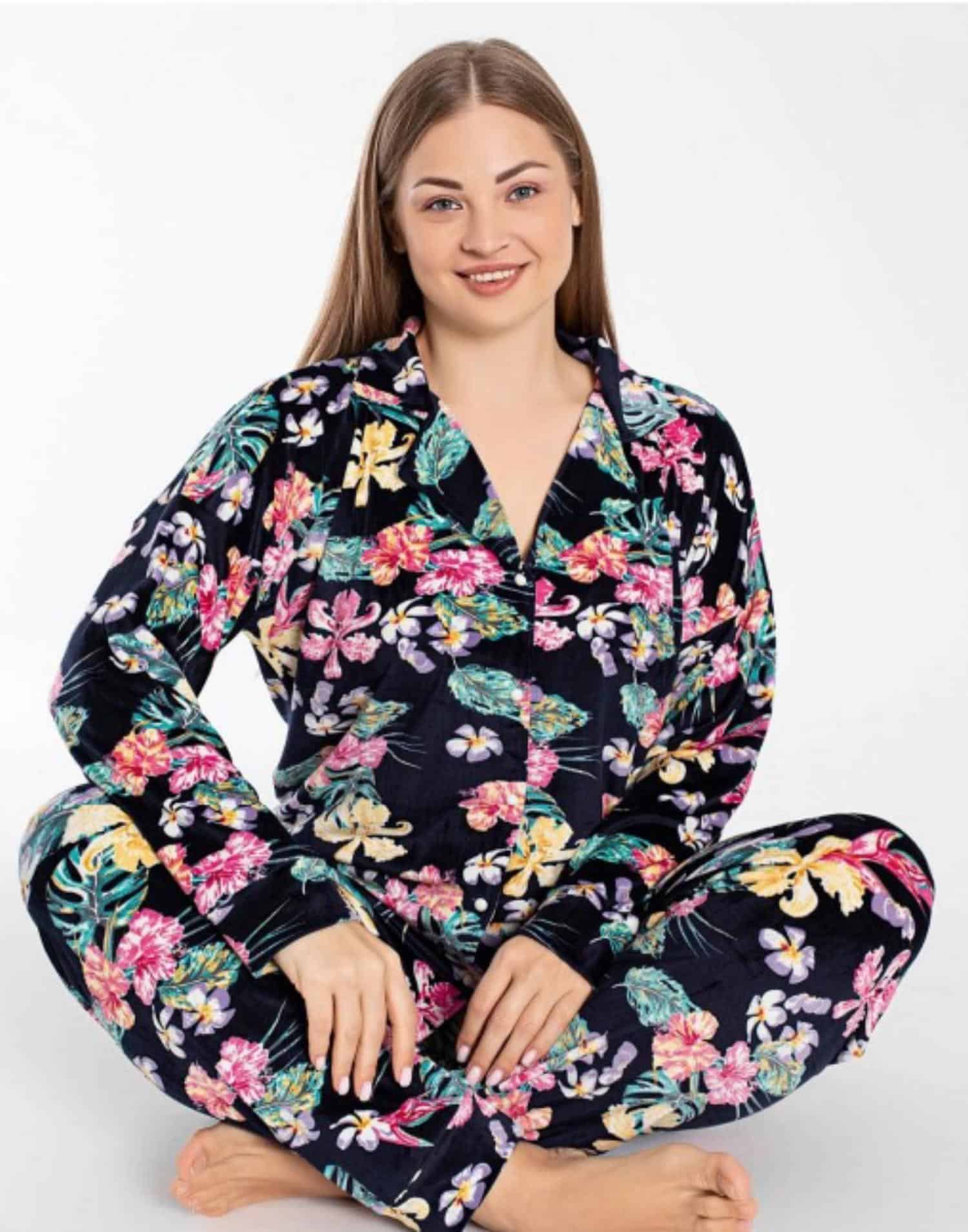 Baskılı Fransız Kadife Önden Düğmeli Pijama Takımı Battal 7150-10